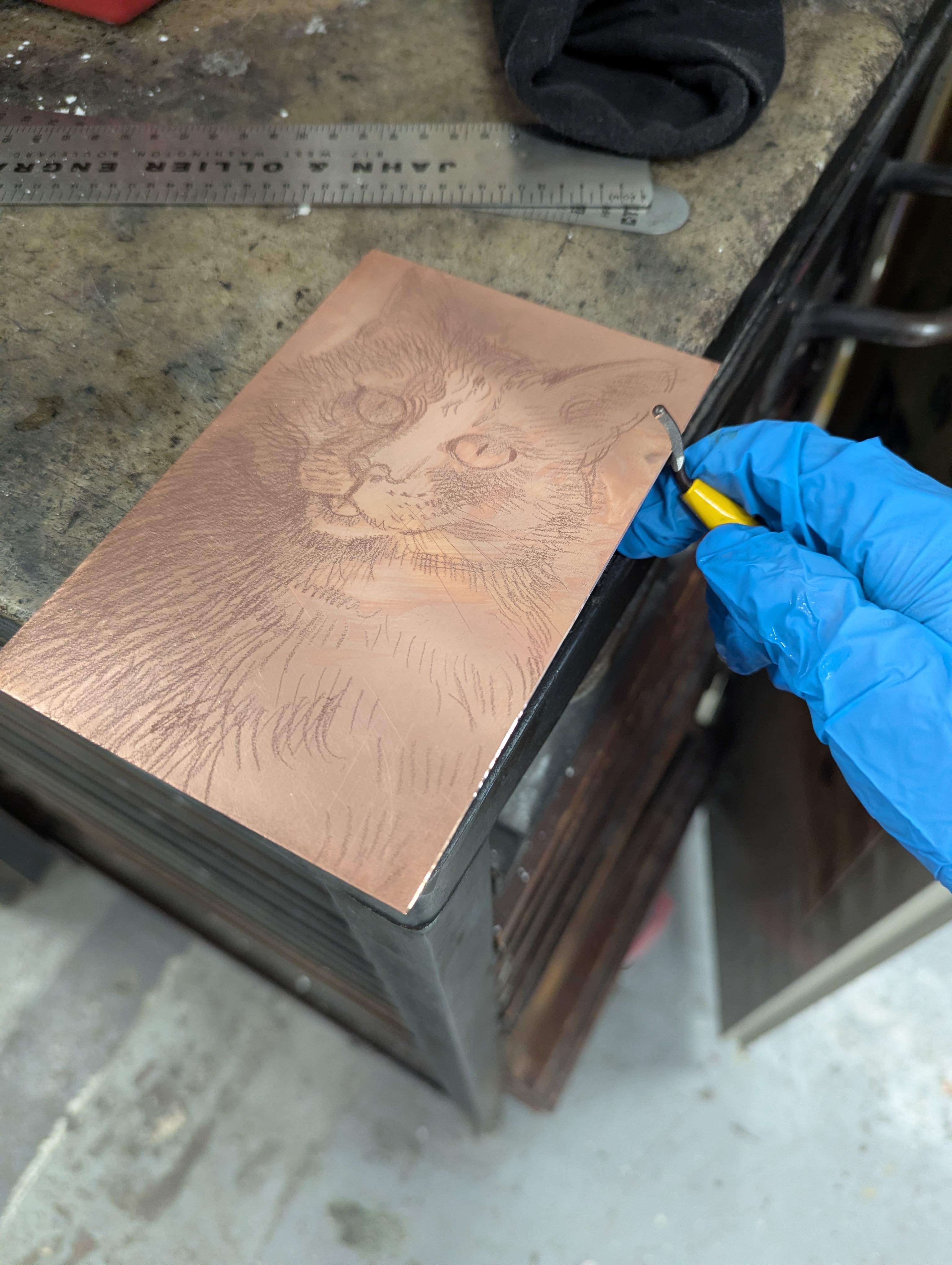 Use the deburring tool (pictured) and/or a flat file to bevel your edges. I use the deburrer and then the file for corners. Careful not to let either tool scrape the surface because it can leave printable marks. Shoot for a 45 degree bevel and be sure to get the corners too. The reason for this tedious step is unbeveled edges might cut your paper, and over time will bruise the printing felts and leave linear marks that will show up in future prints. After that’s done, you’re ready to print!