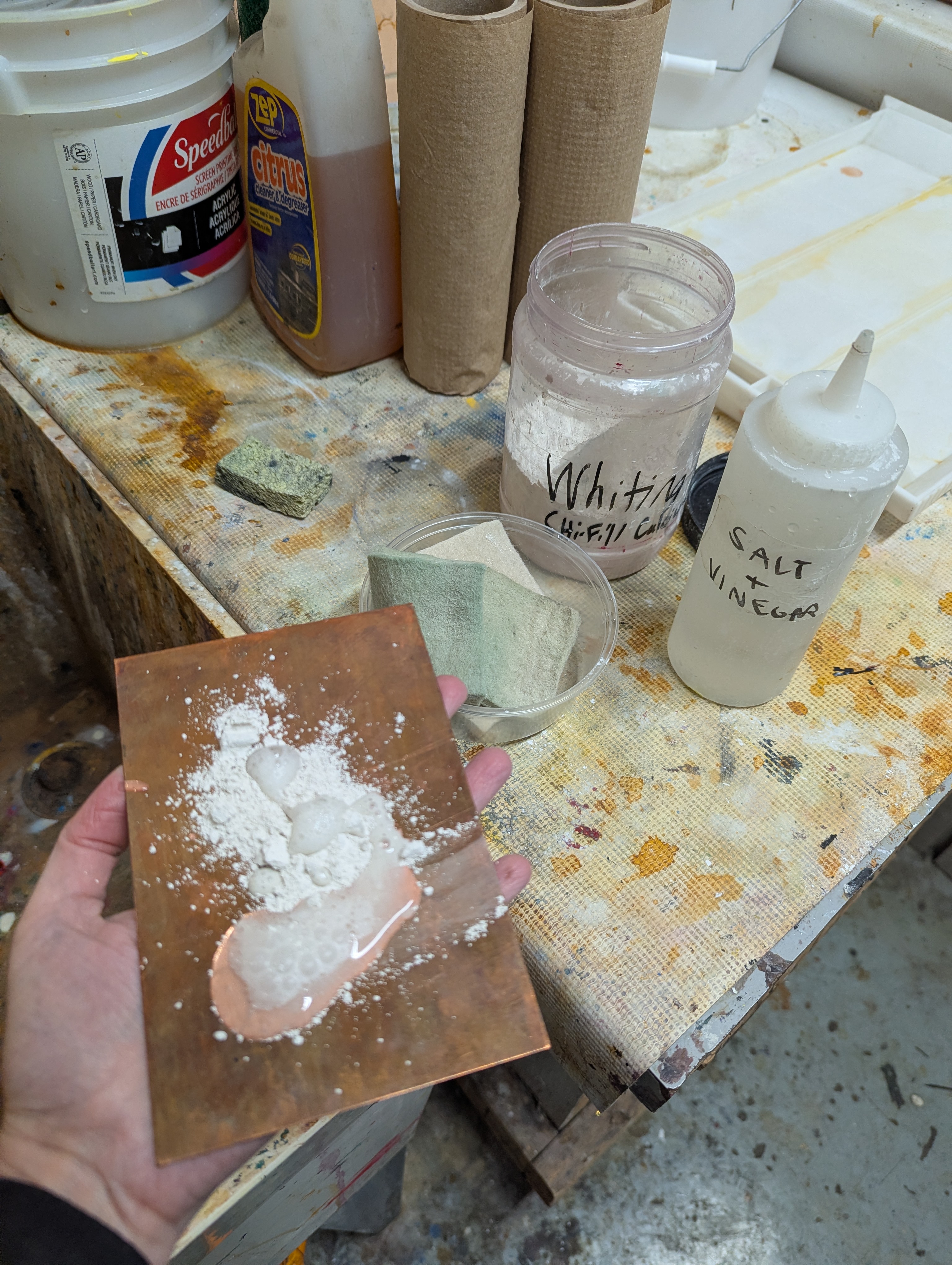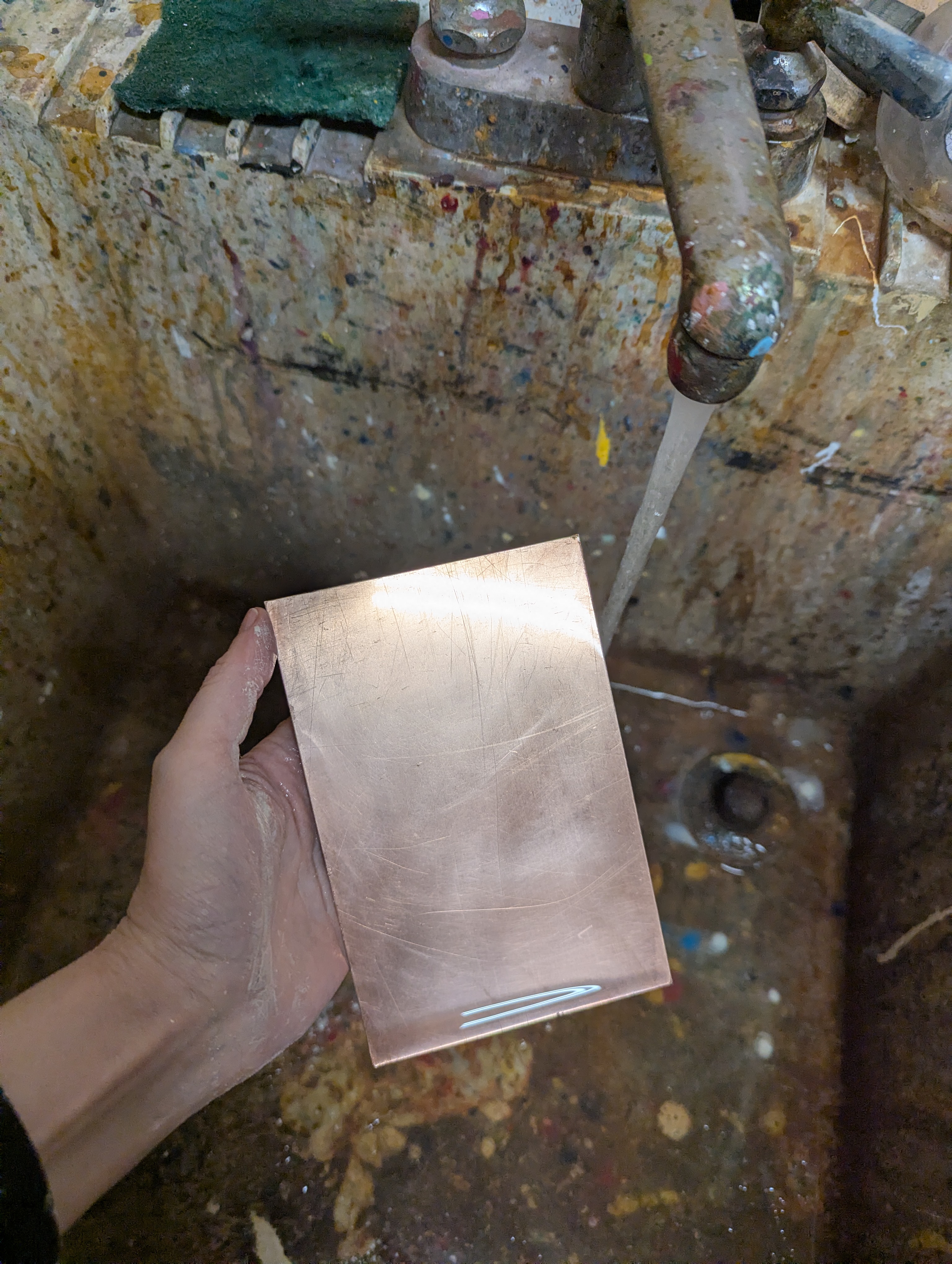 Degrease your plate with vinegar and whiting, using a felt pad to create a paste and then rinsing it clean with water. Dry immediately with a paper towel and don’t touch the degreased face with your fingers after because they’ll grease it up again. When the plate is degreased it should be shiny and the water will “sheet” on it, as opposed to beading up. [Note: traditionalists will point out that ammonia/whiting/distilled water is a more powerful degreaser. True enough, but lord knows we have no ventilation in there and this has been working fine.]