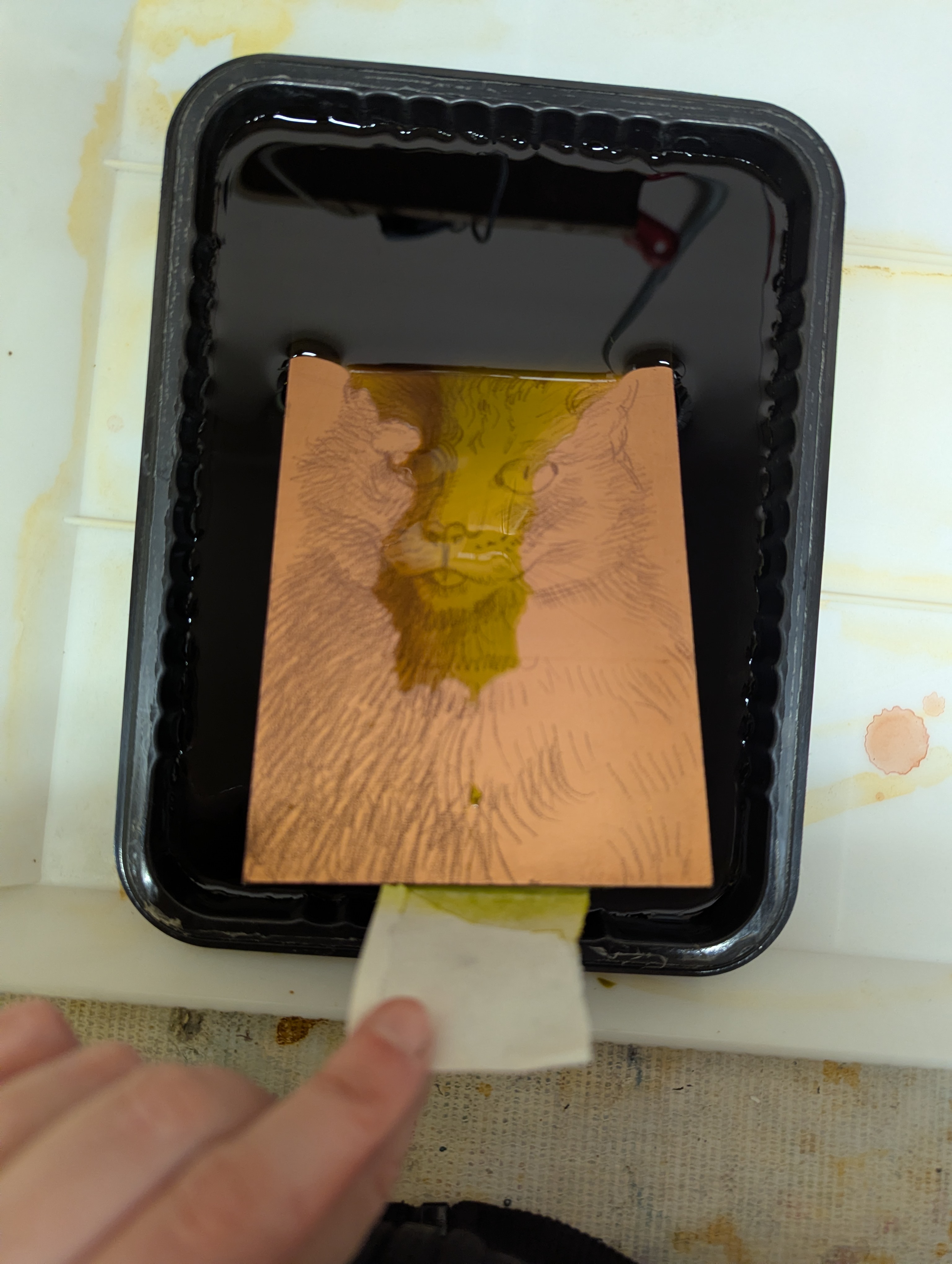 Please use gloves and glasses for acid handling. I typically have two strengths of acid, the upright tank for hardground and a weaker acid for softground. The weaker acid is below the sink, labeled ‘Edinburgh 25degrees Anna Wagner.’ Pull out the acid tray, place your plate in it, and then carefully decant enough acid just to cover your plate. In this example I’m using a food tray which isn’t ideal but it works, but I encourage you to use a real tray. Ten minutes is the minimum etching time for softground to get the imge into the plate, but the image will be real faint. 25/30 minutes will achieve an etch that looks like a regular pencil drawing. 45 mins will create the effect of charcoal pencil. Longer than that and you risk “false biting” (where the acid begins to break down the ground) but that can be an interesting effect. I recommend tipping up the plate every 15 minutes or so to allow etched copper particles to drain away from the plate’s surface. When you are finished, let the plate drip off into the tray and rinse it with water thoroughly, strip off the backing and throw it away and then rinse your plate again. Let the water run for a minute after to allow the acid to dilute so that it doesn’t corrode the pipes. With goggles on, pour the remaining acid carefully back into the jar with the funnel over the sink.
